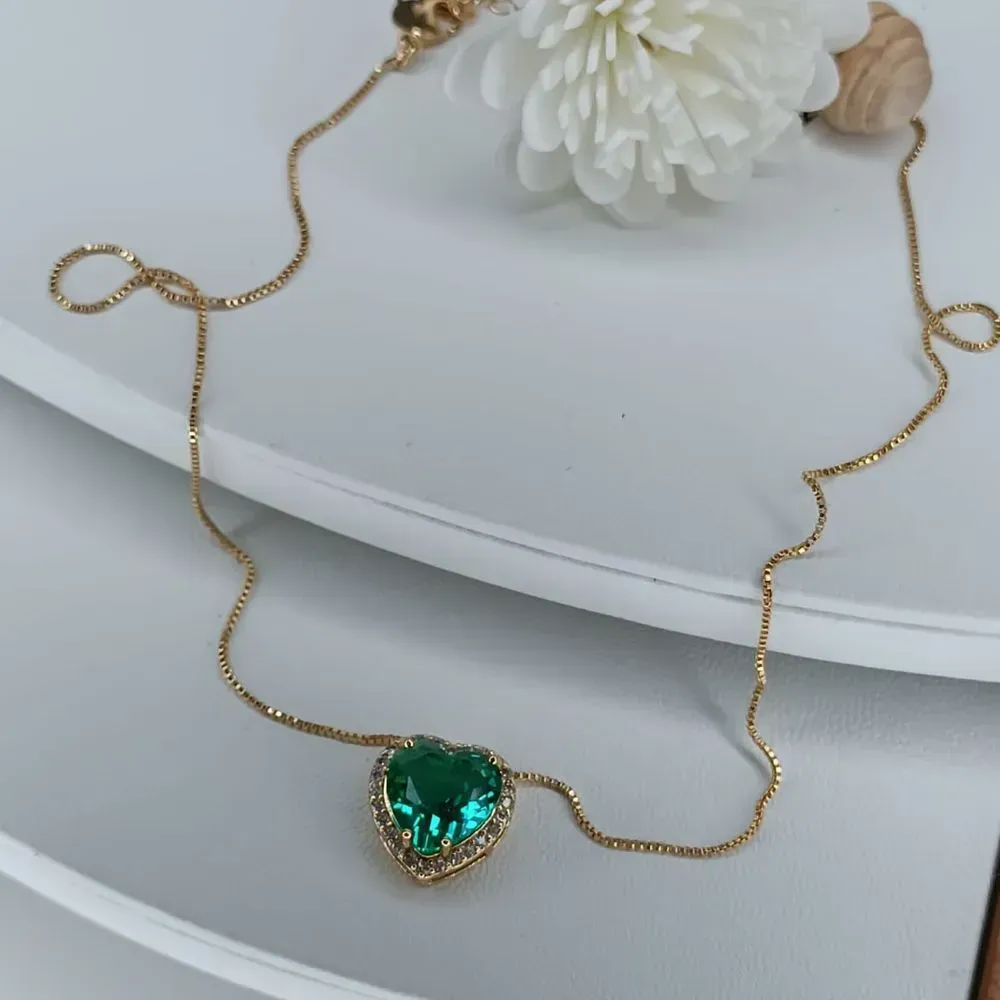 COLAR CORAÇÃO PEDRA ESMERALDA CRAVEJADO P -